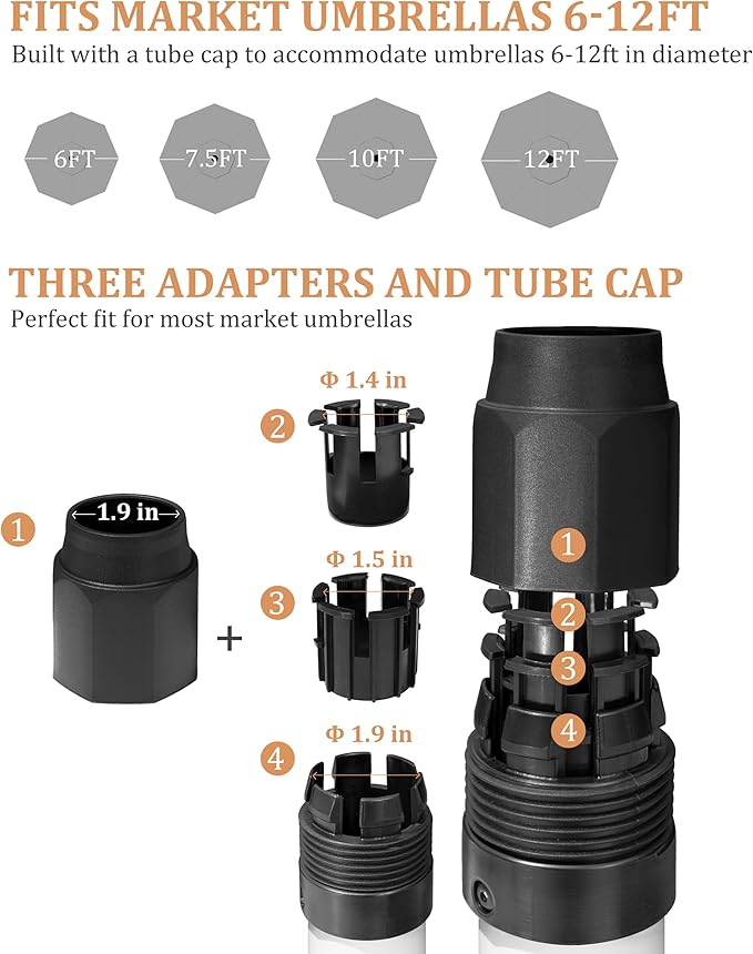- Fits 1.4 to 1.9-inch Poles: Includes 3 adjustable knobs to perfectly suitable market umbrella poles of different sizes.