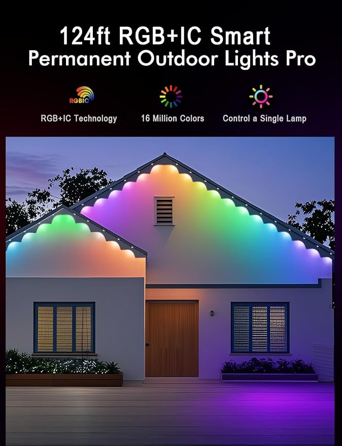 Permanent Outdoor Lights for House & Year-Round Use - Smart RGB+IC Color Changing Lights with APP/Voice Control, IP67 Waterproof, 124FT 72LEDs - Christmas, Patio, Garden, Commercial Decoration