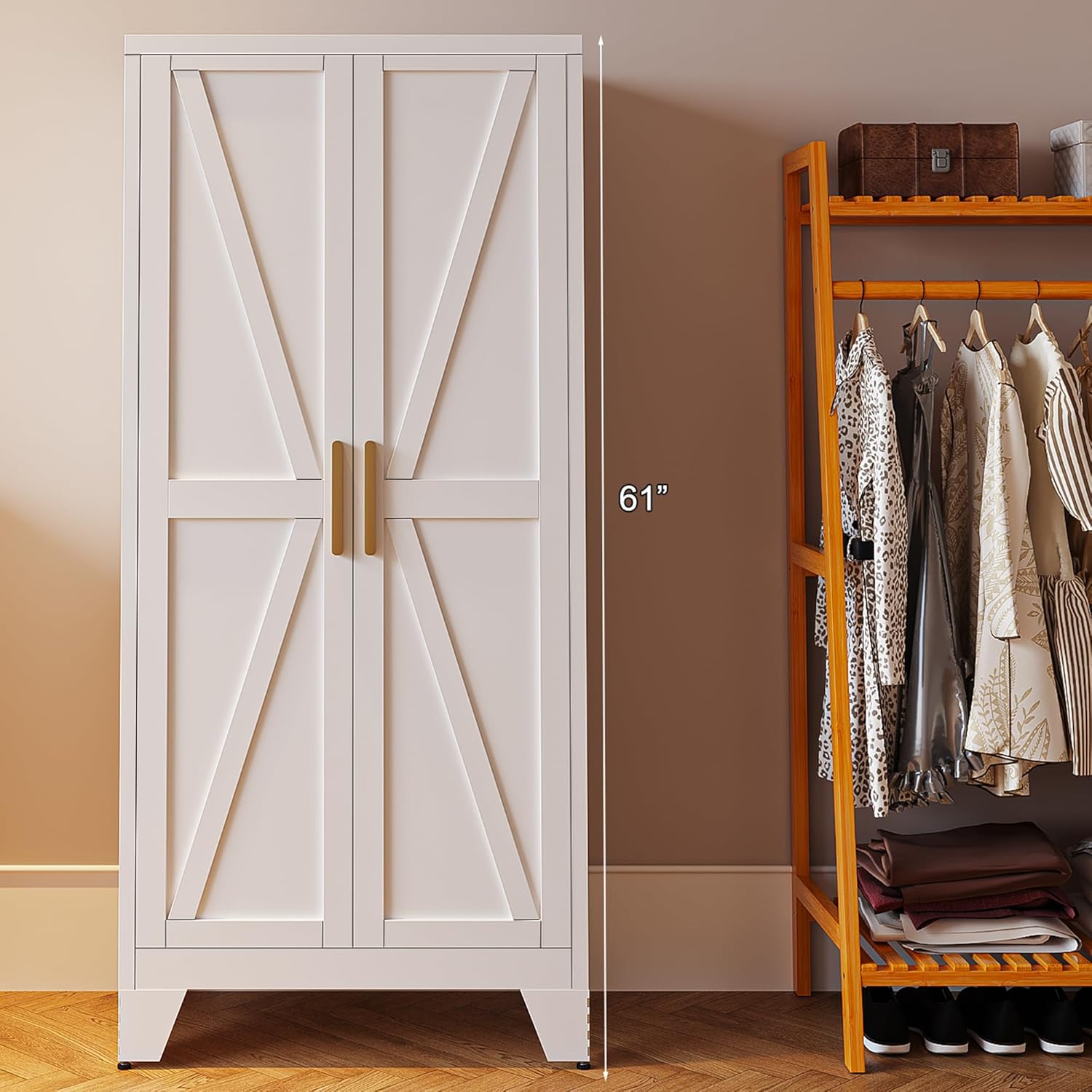 61" Tall Farmhouse Metal Pantry Cabinet, Kitchen Pantry Storage Cabinets with 2 Barn Door and Adjustable Shelves,Metal Pantry Storage Cabinet,for Kitchen,Laundry Room,Home Office,Kids Room (White)