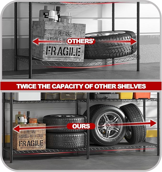 - 【The Durable Heavy-Duty Wire Shelving Loads 1450 Pounds.】This heavy-duty shelves is made of sturdy heavy-duty wire. storage shelf has undergone special coating treatment and is equipped with anti-tip components, endowing it with excellent stability and durability. The garage shelves can bear a total weight of 1450 pounds. Whether you need to store heavy tools, a large number of books, or various large-sized items, this shelving unit is perfectly capable of handling it.