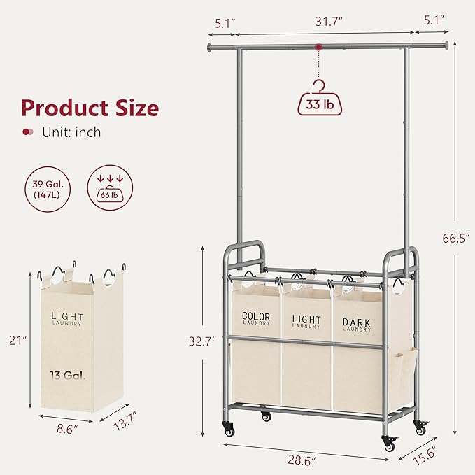 - 【Sturdy & Durable】Made of heavy-duty metal frame that can hold up to 66 lbs. 7 Extra horizontal bars make the frame sturdy and prevent the bag from sagging when filled with laundry. 4 heavy-duty casters allow the laundry hamper with hanging rack to move freely.