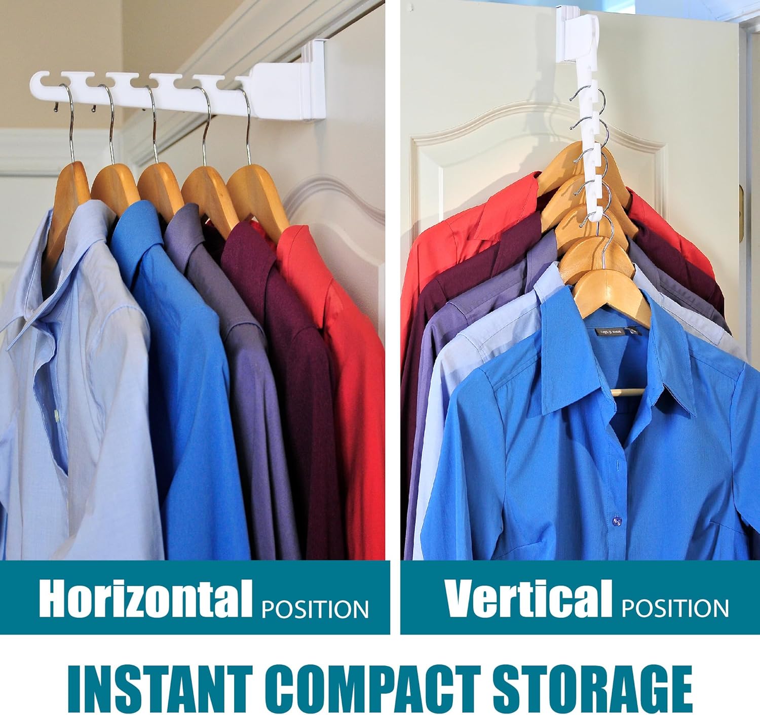 - CLOTHES HANGER RACK FOR INSTANT DRYING: Each hanger rack features wide notches that let you double up on hangers so you can keep clothes wrinkle-free and triple your closet space by adding an over-the-door hook hanger to any free door in the house. It can even serve as an instant laundry hanging rack for items you can only line dry.
