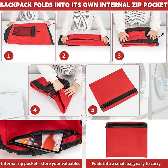 Laundry Bag Backpack with Shoulder Straps and Mesh Pocket Foldable Laundry Hamper for College, Apartment, Laundromat (Red)