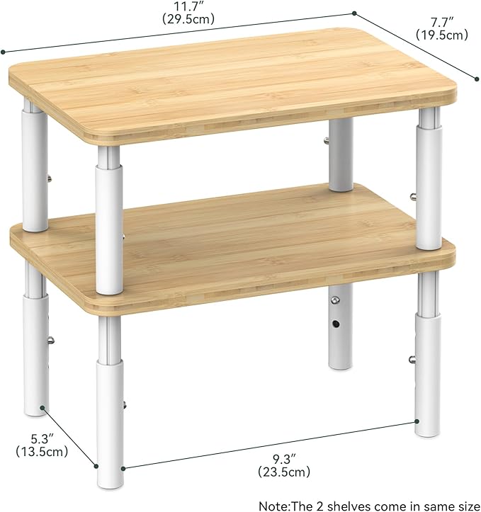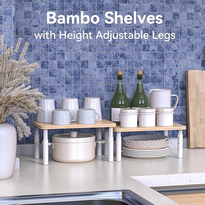 Cabinet Organizer Shelf, Spice Rack Set of 2 Kitchen Pantry Cupboard Shelves, Stackable, Height Adjustable, Natural Bamboo (11.7" W)
