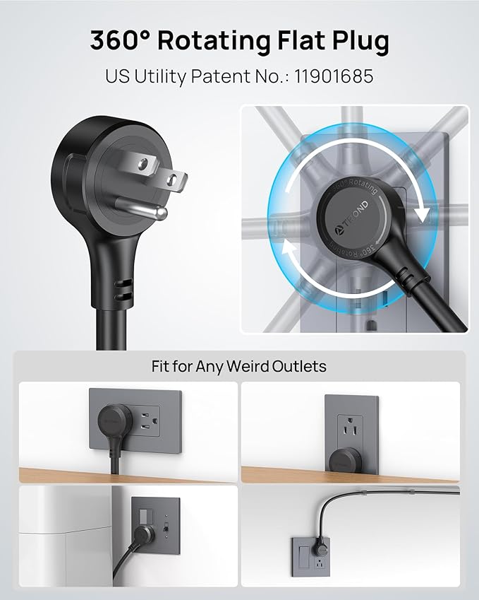 - 360° Rotating Flat Plug: This power strip features a swivel plug (0.73 inches in thickness), and the unique rotating design allows the plug to adjust to any angle, providing more flexibility and convenience in tight spaces. US Utility Patent No.: 11901685