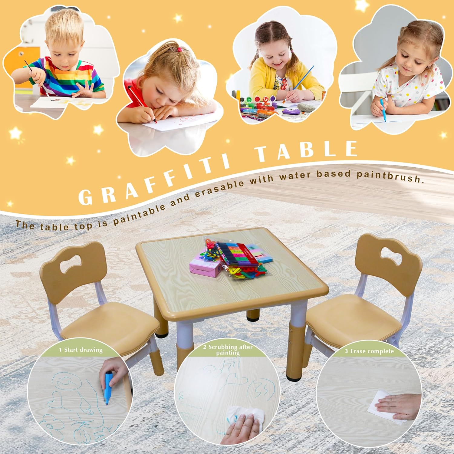- 【Erasable Desktop】The surface of the toddler table is coated with polyurethane, enhancing its water resistance and durability against cracks. Watercolor and colored pencil marks can be wiped off the table with just a damp cloth! Enabling children to freely express their artistic abilities. IMPORTANT: It is advised to use a damp cloth for cleaning purposes.