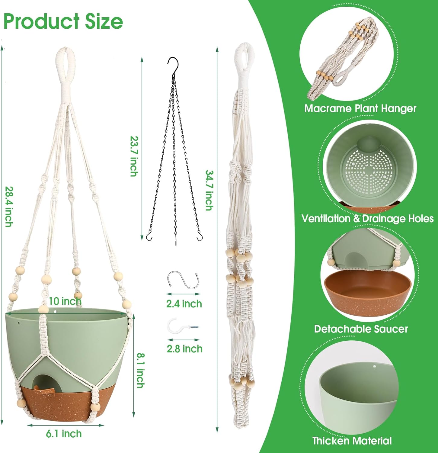 - Package Includes: 10 inch Hanging planters set of 2 include 2 pack 10 inch plant pots, 2pcs macrame plant hanger, 2pcs sturdy metal hanger and 4pcs hooks. Please note: No plants included.