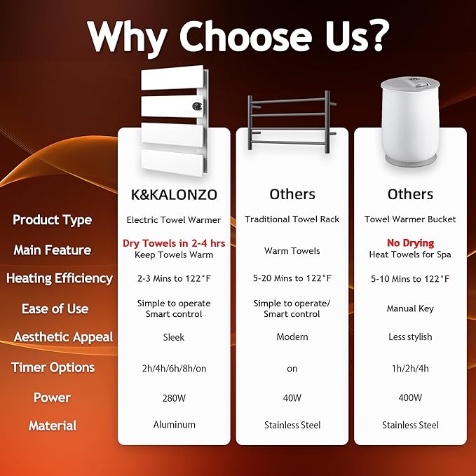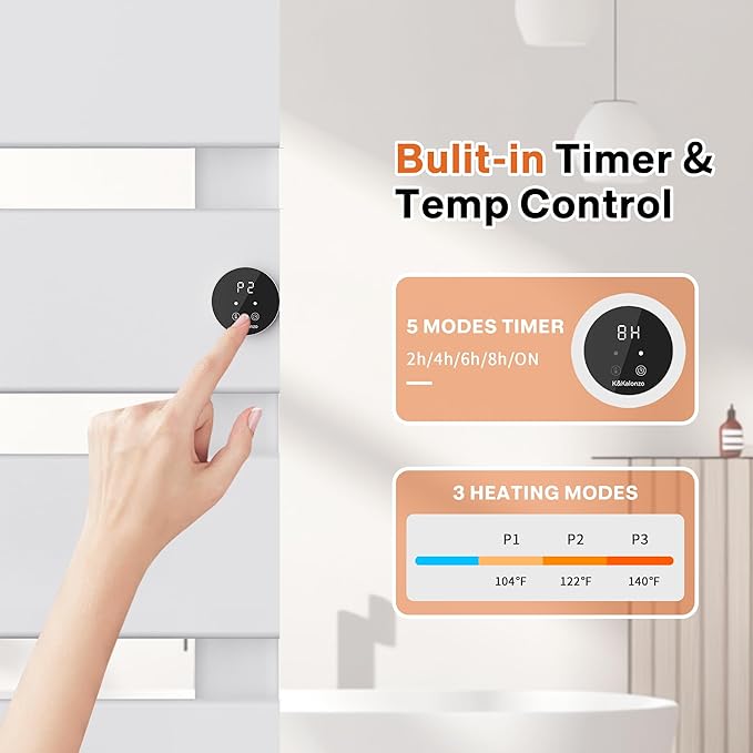 - [Premium Aerospace Aluminum Build]: Crafted from aerospace aluminum with delicate construction, K&Kalonzo electric towel warmer combines durability with a sleek, chic design. It's waterproof and anti-scalding, making it a safe and stylish addition to any space
