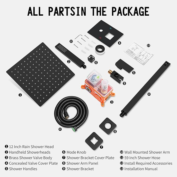 - Complete Shower System Included: This shower faucet set includes everything you need for a luxurious upgrade: a 12-inch rain shower head, a handheld shower head, a 59-inch shower hose, a 15.7-inch shower arm, a handheld bracket, a mixing valve, a panel, a handle, a mode knob, shower arm and bracket covers, and all necessary installation accessories