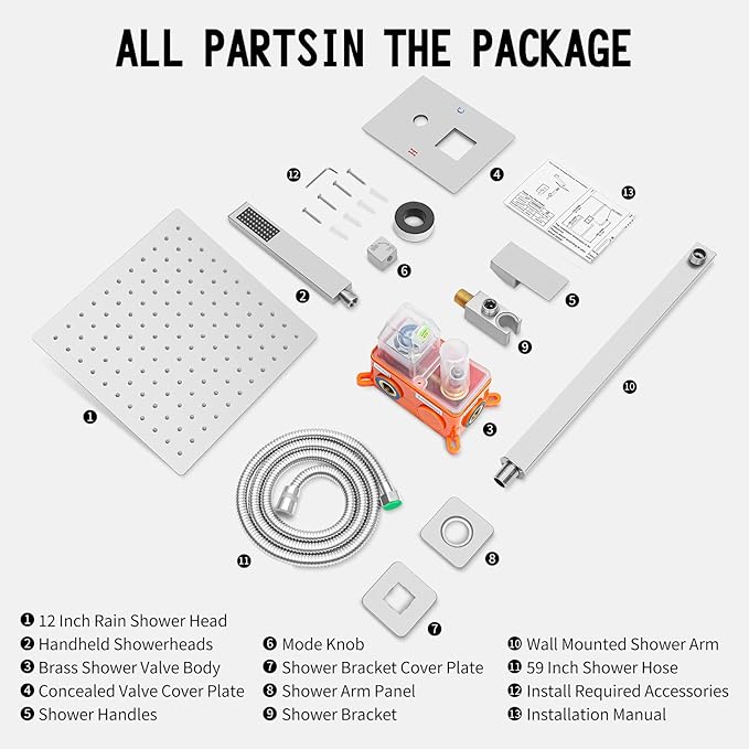 - Complete Shower System Included: This shower faucet set includes everything you need for a luxurious upgrade: a 12-inch rain shower head, a handheld shower head, a 59-inch shower hose, a 15.7-inch shower arm, a handheld bracket, a mixing valve, a panel, a handle, a mode knob, shower arm and bracket covers, and all necessary installation accessories