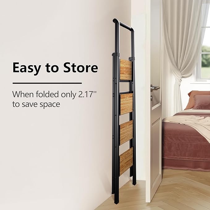 Step Ladder 4 Step Folding Stool with Anti-Slip Widened Sturdy Pedal and Handgrip, Portable Lightweight Aluminum Ladder for Home,Kitchen,300 lbs Capacity-Black+Woodgrain