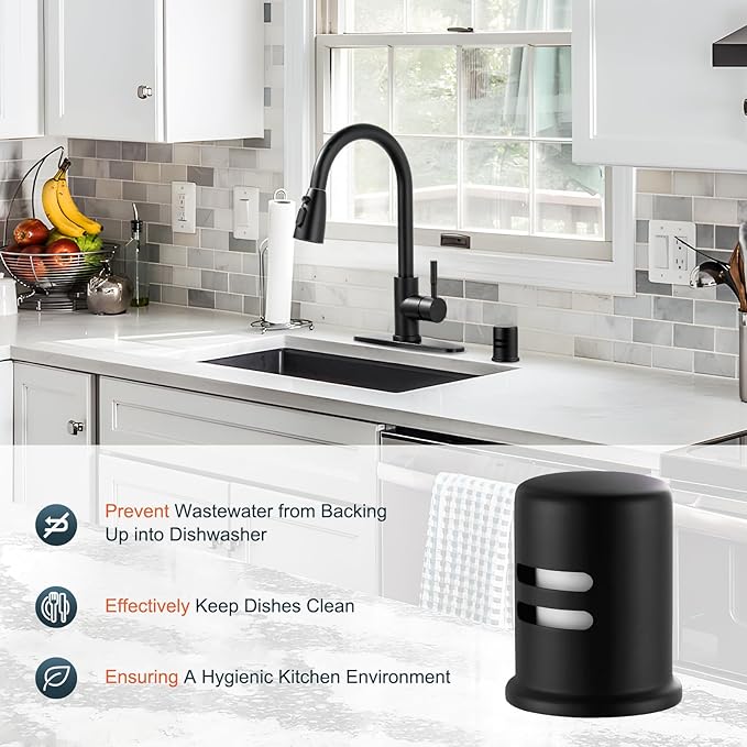- Elegant and Stylish Design: Feature high-end matte black finish, the dishwasher air gap cover kit not only enhances the visual appeal of your kitchen, but also includes a curved top design that prevents water vapor buildup, reducing the risk of paint peeling and maintaining a flawless appearance over time.