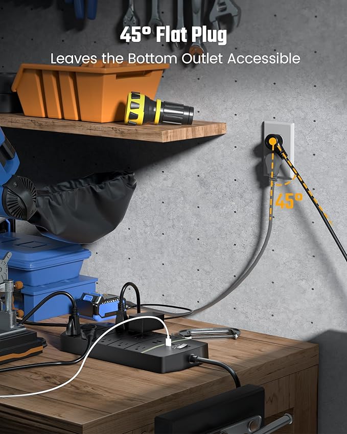 - Space-Saving Design: A clean workspace is essential for efficiency and productivity. A 45° flat plug is meticulously designed to fit in tight spaces behind the workbench or furniture, while leaving the bottom outlet usable. Screws and a drill template are included for you to easily wall-mount the power strip for easier access to power.