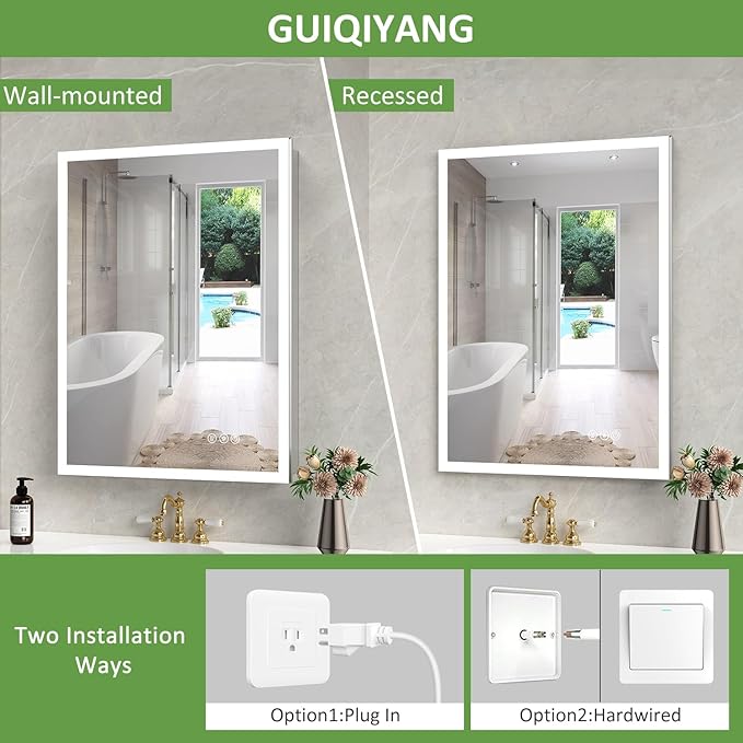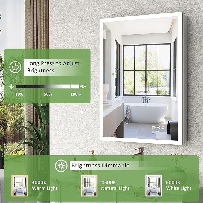 - Adjustable Illumination Features: GUIQIYANG Medicine cabinet is equipped with customizable light intensity, enabling you to create the ideal ambiance for any hour of the day. Select from three distinct color temperatures—cool white, natural white, and warm yellow—allowing you to fine-tune your lighting to meet your preferences.