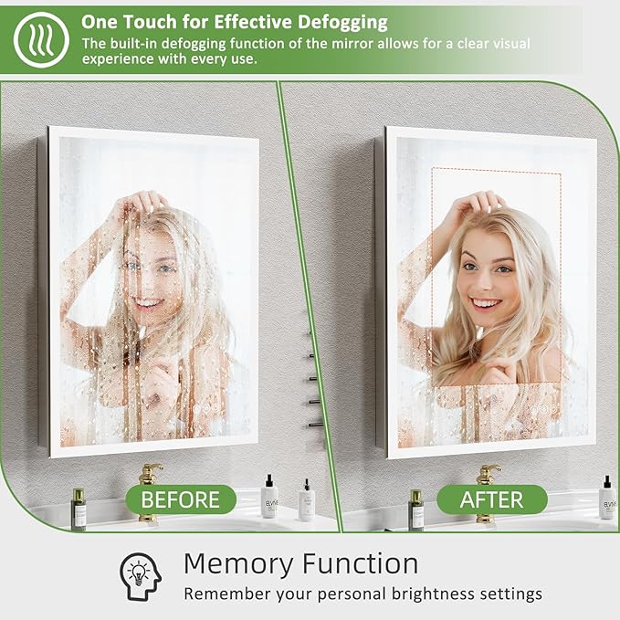 - Anti-Fog Technology:Never worry about foggy mirrors again! The storage wall-mounted medicine cabinet with anti-fog feature ensures a clear reflection, even after hot showers, providing convenience and clarity when you need it most.