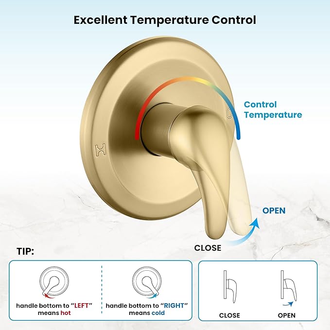 - 【Durability Material】:Brushed Gold finish provides a modern look, premium metal materials ensure corrosion resistance and durability, ensuring durability and reliability. The valve body of this shower trim kit is made of copper, which is more solid.