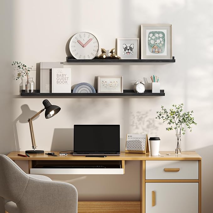 - Quick and Easy Installation: With pre-drilled holes, necessary hardware, and easy-to-follow instructions, our picture ledge shelves are a breeze to install. Each set even comes with a mini level for perfect alignment. Put them up in minutes and start decorating right away!