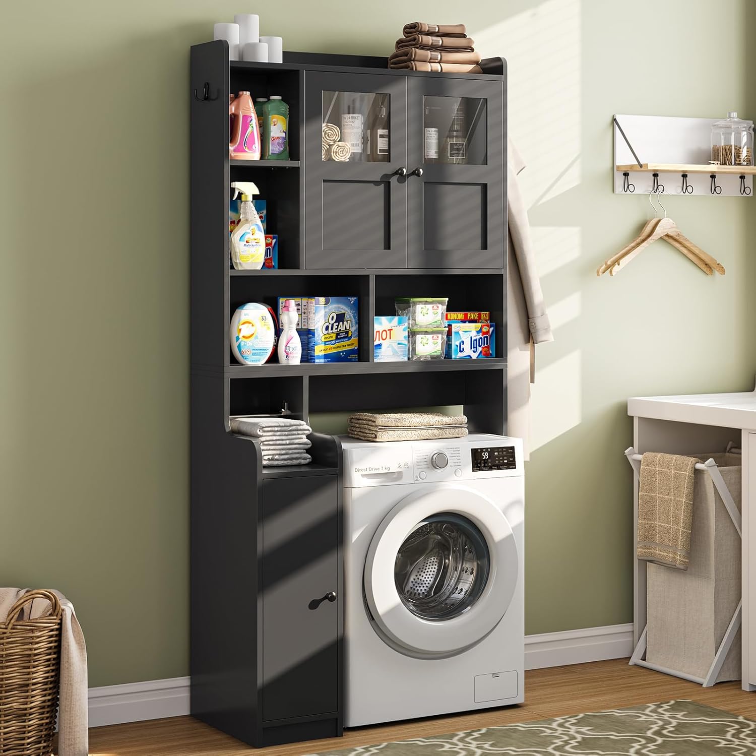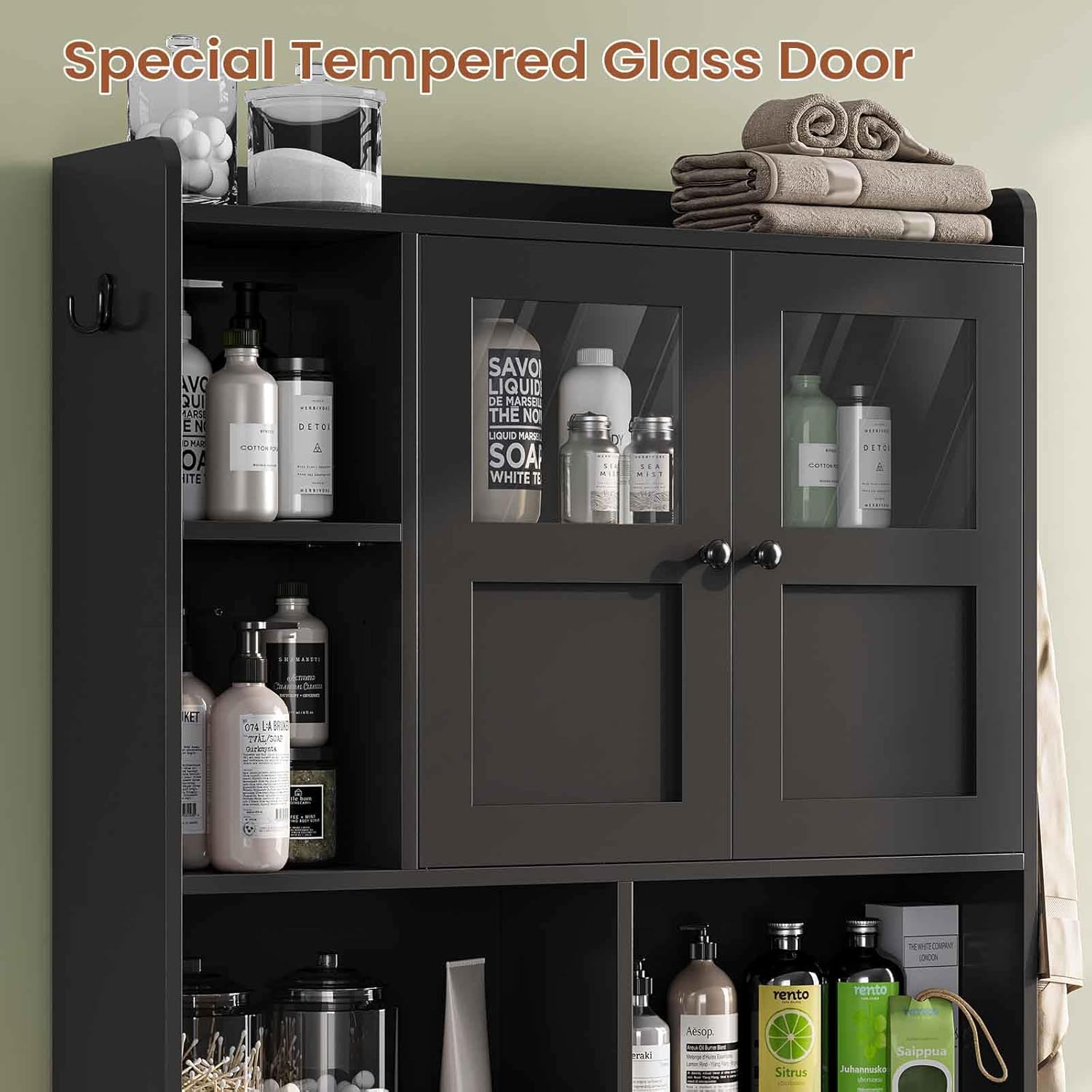 - 【Modern Tempered Glass Design】This black bathroom storage cabinet with clear tempered glass doors allows you to easily find what you need, combining practicality with aesthetics. Designed in modern minimalist style, it has a charming look that complements your home decor.