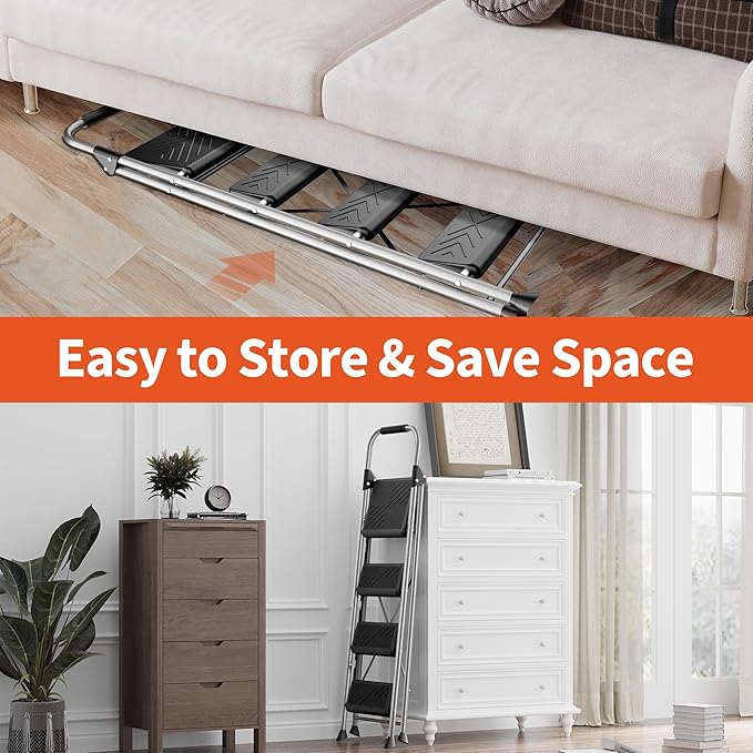 - Portable and Space Saving: This folding step stool folds to just 3 inches, making it easy to store against walls, in corners, under beds, or in closets. Made from high-quality lightweight steel, it's easy to carry with just one hand.