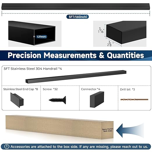 - Robust T304 Rust-Resistant: Unlike iron handrails, our T304 stainless steel handrail features a matte black powder coating, ensuring exceptional resistance to rust and corrosion. With its superior durability, high hardness, and impact resistance, it can be resistant to deformations. Please notice that for coastal areas, we recommend our aluminum handrails (B0DL5QFR9H) for enhanced durability.