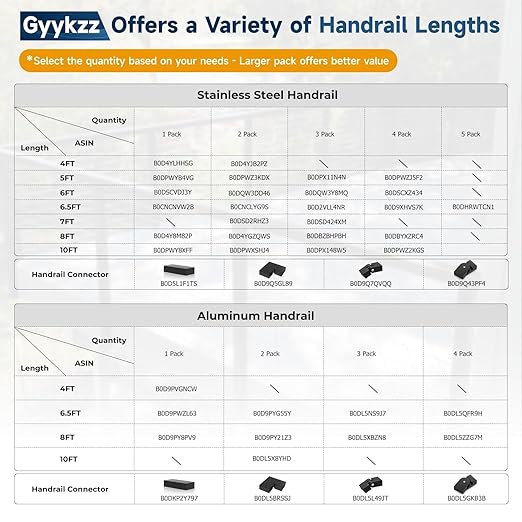 - Related Options: We offer a variety of packaging quantities and handrail lengths, along with connector blocks for different angle scenarios. Additionally, we provide 36" and 42" cable railing posts to complete your cable railing project. For more details, please visit our store. Opting for SKUs with larger quantities can enhance cost efficiency.