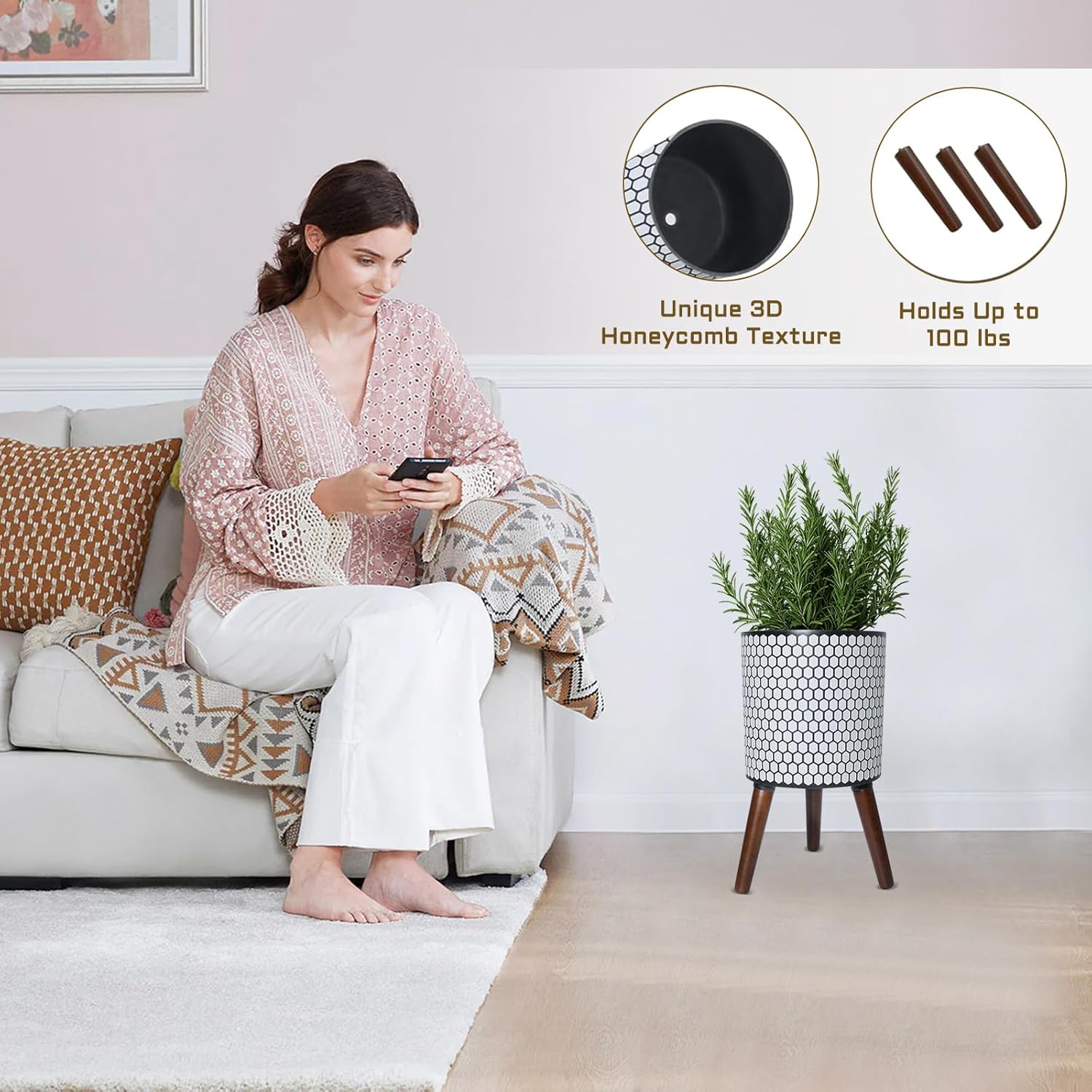 Flower Pot with Legs Tall Flower Pot with Drainage Holes for Indoor and Outdoor Decorative Planting (White Black Honeycomb, 10 Inches)