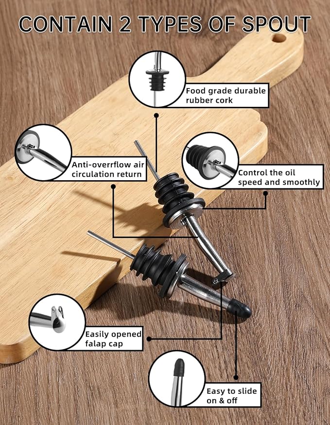 - Two Controlled Pouring Spouts - 18/8 Stainless steel pour spouts with sealed cap or flap cap, fit the bottle well and keep dust out. The pouring fluid is smooth without sticking and can easily dispense the right amount of oil for a healthy diet.
