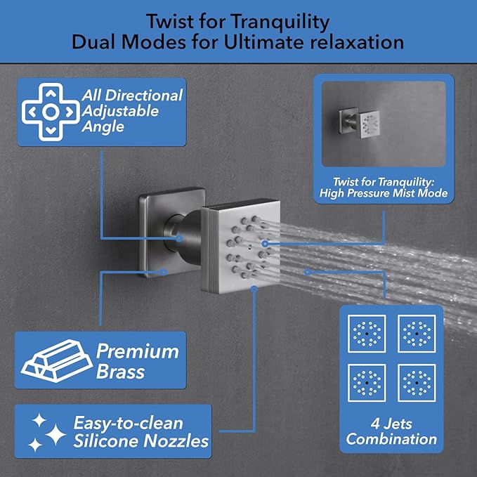 - Dual Modes Body Jets (2 Inch): VANFOXLE introduces its innovative body jets — comprising 4 sets of sprayers with high water pressure. The body jets can be easily rotated to switch between spray mode and mist mode. They also have adjustable angles and an all-directional "joy stick design" that accommodates every user's body type. Additionally, these body jets are 30% more energy efficient.