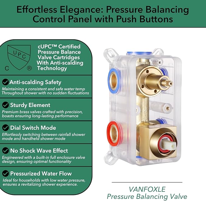 - Certified Anti-Scalding Shower Valve and Safe Shower System: This shower system is made with your family’s safety in mind. Equipped with a cUPC certified pressure balance shower head valve, it ensures quality, longevity, and prevents burns due to sudden fluctuations in hot or cold water temperature.