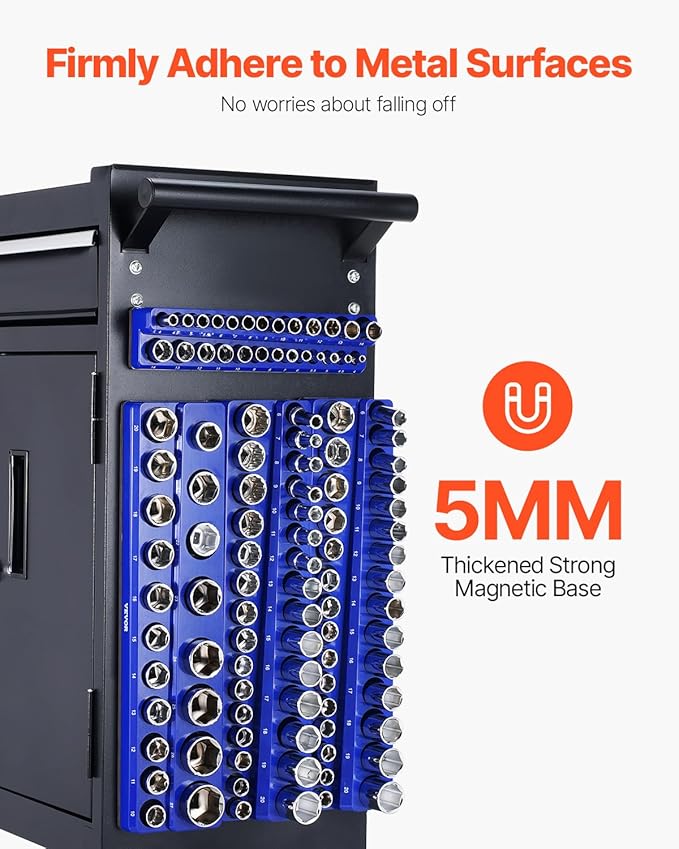 - Strong Magnetic Base: Featuring a robust 5mm thick magnetic base composed of ferrite and CPE, our socket organizers for toolbox provides strong, stable attachment to metal surfaces, keeping sockets trays firmly in place without slipping.