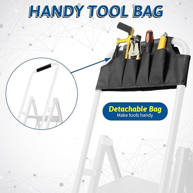 - 【Enhanced Safety & Convenience】The Double Elite 5 Step Folding Ladder is designed for enhanced safety & ease of use. The 5 step ladder is equipped with extra-long 38 inch handrails to keep you well supported as you climb up or down. And a removable 4-pocket tool bag is attached over the handgrip, so your essential tools are within reach.