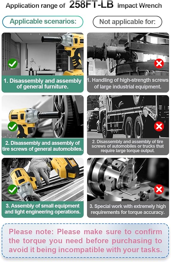 - 【Powerful Torque & Direction Control】 This Cordless Impact Wrench delivers up to 258ft-lb (350N.m) torque with speeds reaching 2800rpm, making it suitable for tasks such as car tire bolts, furniture assembly, and general engineering work. With its direction control and auto-stop mode, it ensures safe and accurate operation.