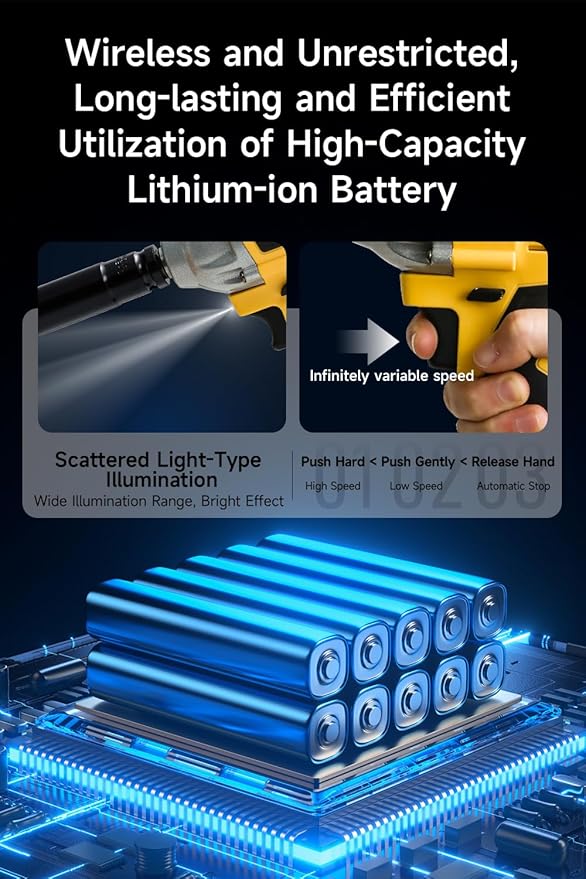 - 【Extended Battery Life & LED Illumination】 Equipped with high-capacity lithium batteries, the Cordless Impact Wrench supports longer working sessions. Two included batteries help reduce downtime, while the built-in LED light improves visibility in dim environments.