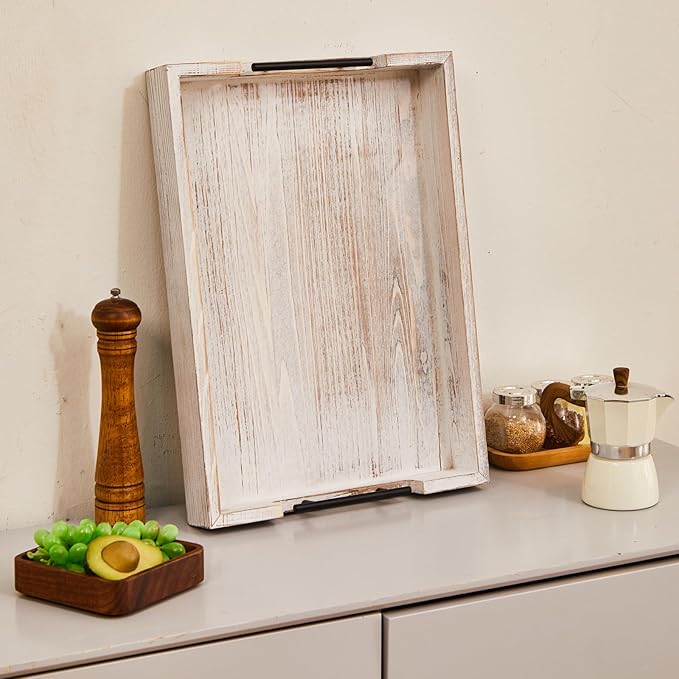 Ottoman Tray Large Serving Trays Farmhouse Decor Wooden Coffee Table Platter with Handles White Tray for Bed Kitchen Living Room 19 * 14Inch