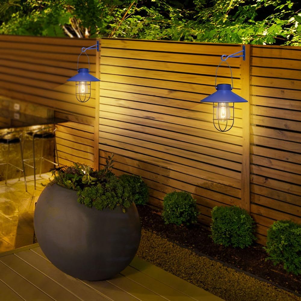 - 【SOLAR POWERED LANTERN】--New color marsh blue farmhouse lantern style design + warm LED Tungsten light bulb. The surface of the lantern has a special old process treatment, please don't worry about the quality problem.This Solar Lantern can be hung on anywhere you want, perfect for garden, yard, patio, porch, wall, pathway, driveway, lawn, camping, trees, pergolas, etc. outdoor solar landscape lighting and decoration.