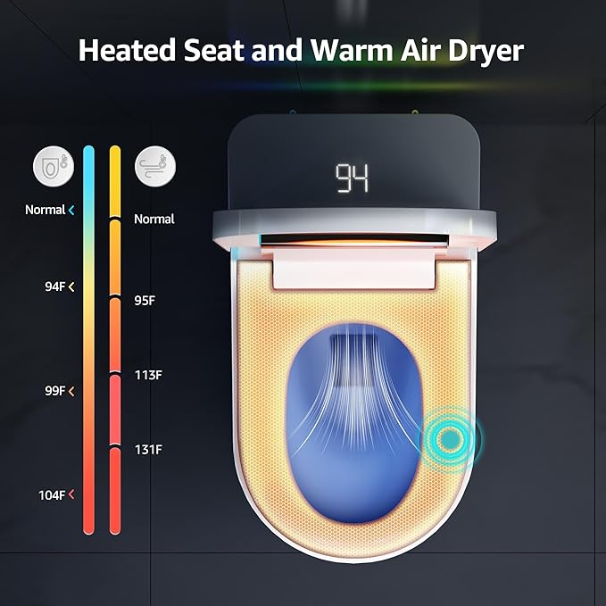 - 📱 SIMPLE & SAFE CONTROLS: Easily adjust settings via the wireless remote or rotary one-touch button. The bidet toilet features an LCD display, flame-retardant materials, and IPX4 waterproofing for safe, luxurious use