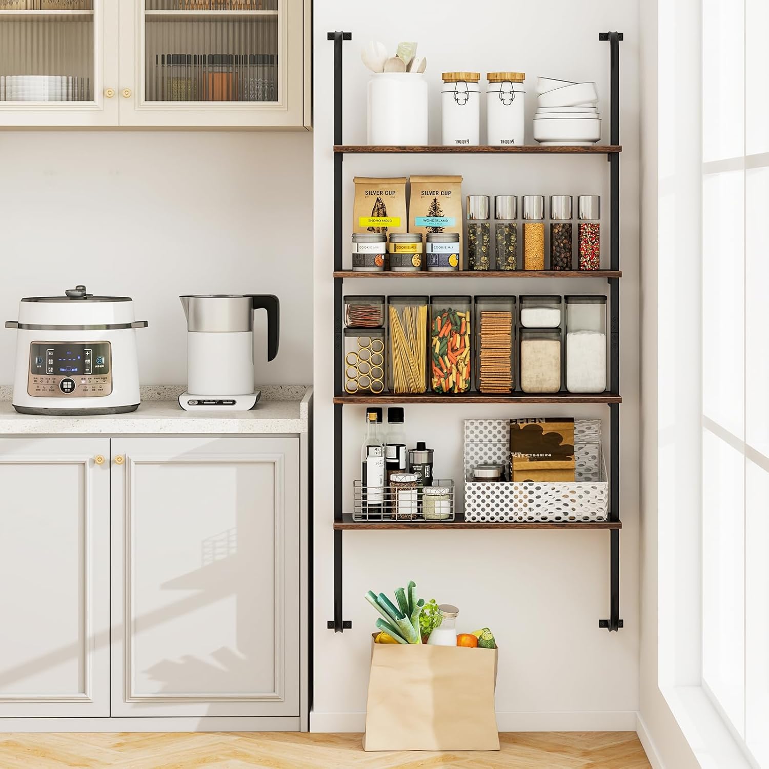 Giantex 4-Tier Industrial Bookshelf, Wall Mounted Pipe Shelving Unit, Floating Shelves with Metal Frame, Hanging Wall Display Shelf, Wood Ladder Bookshelf for Living Room, Kitchen, Rustic Brown