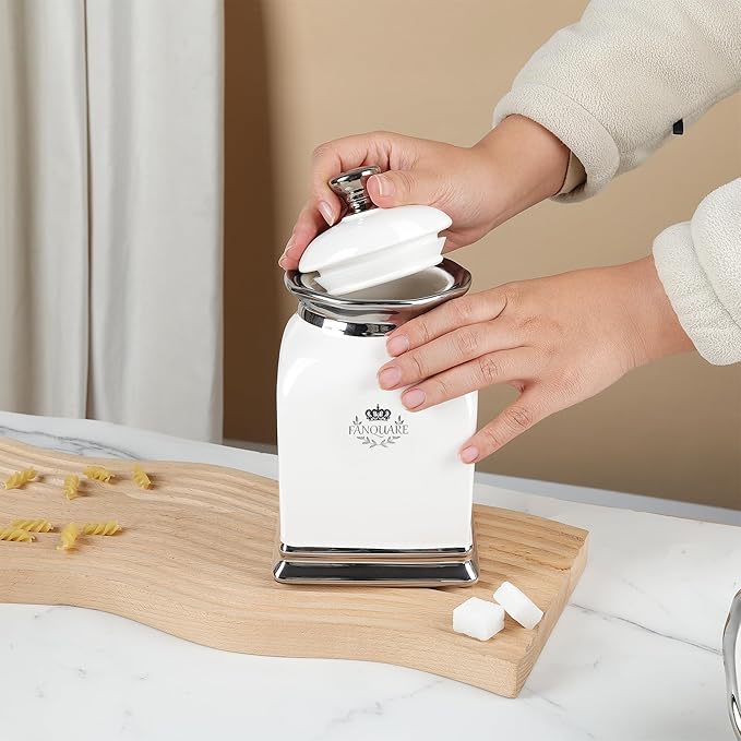 - FEATURE: With a simple square look paired with elegant ruffles, this set of ceramic containers can be a beautiful decoration in your home. With lid, this kitchen jar protects sugar from dust, just a fabulous partner for your daily drink