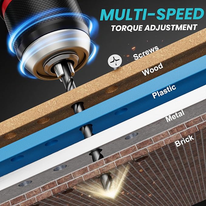 - 20+1 Torque Settings: This professional cordless drill offers 20+1 torque settings (0-2000 RPM) for precise control, preventing screw damage. The 1/2" all-metal chuck includes drilling, driving, and hammering modes. It easily handles wood, ceramics, metal, and concrete, with max torque for drilling up to 1.55 inches in wood, 1/2