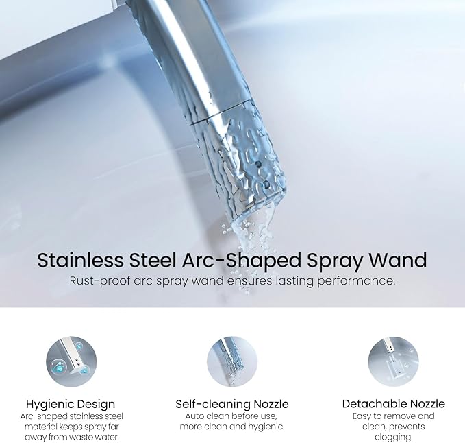 - Hygienic Stainless Steel Nozzle - Self-cleaning with multiple wash modes (front/rear/oscillating). Removable nozzle for easy cleaning and long-lasting hygiene.
