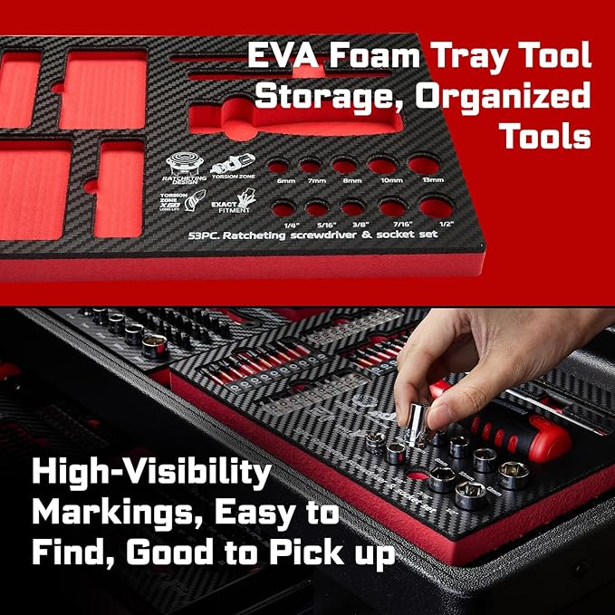 - Pre-cut Foam Tray: This Storage Tray is tailored to the space of each tool, protecting the tools and keeping them surprisingly organized. Markers on the tray will also help you quickly find the tools you need.