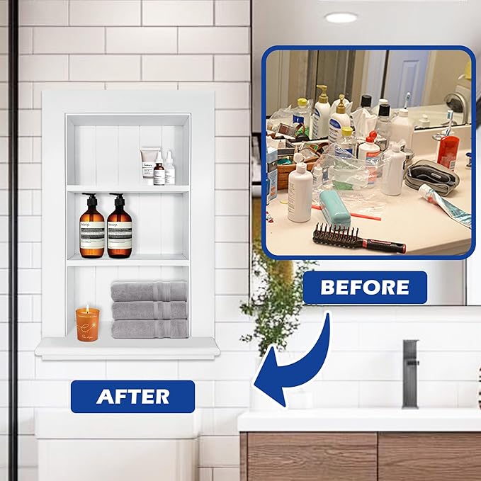 - 【Versatile Storage for Any Room】Ideal for the bathroom, living room, bedroom, hallway, or entryway, this multi-functional niche provides the wonderful space to store and display your essentials. Use it to organize toiletries, showcase decorative accents, or keep frequently used items within easy reach—adding both style and convenience to your home.