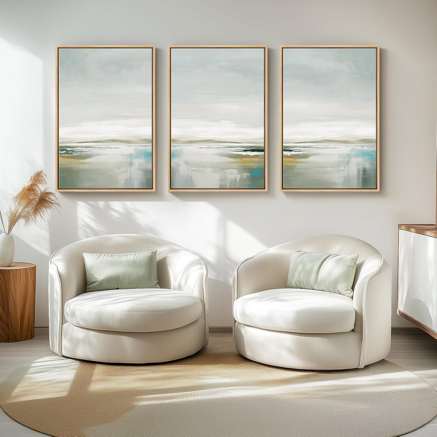 - [Abstract Wall Art]: This set of abstract wall art features soft hues like light green and pale blue, created with simple yet expressive brushstrokes. The result is a tranquil, layered look that exudes elegance. Encased in a solid-wood frame, it adds natural warmth and enhances its decorative appeal. Perfect for the living room, hallway, staircase, bedroom, or office, this art elevates any space effortlessly