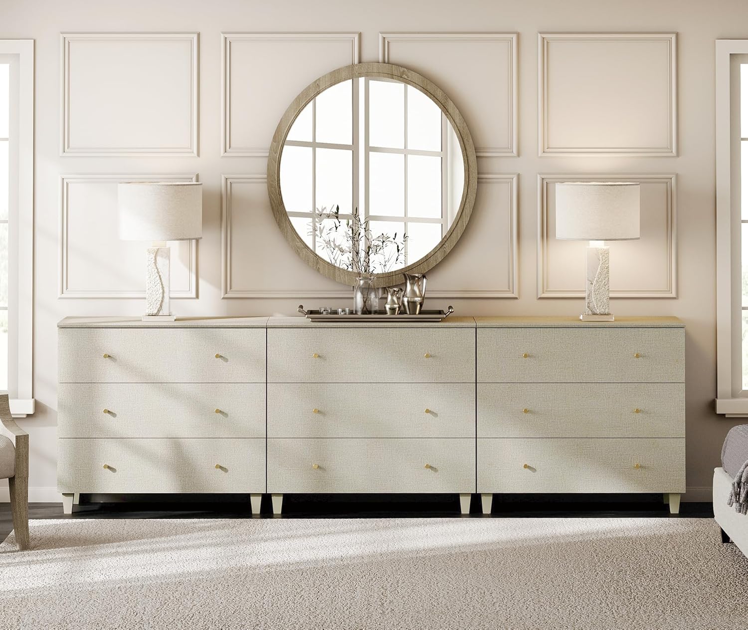 WAMPAT Dresser with 9 Drawers for Bedroom, 106" Wide Wooden Chest of Drawers, Modern Long Dressers Closet Storage Organizer with Solid Wood Legs for Living Room, Kids Room, Nursery, Beige