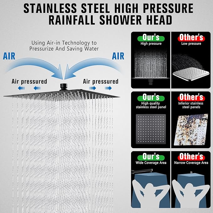 - 【Rainfall Shower Experience】Features an ultra-slim rain showerhead with air-injection technology that mixes water and air to simulate natural rainfall, delivering powerful water pressure for a truly refreshing shower experience.
