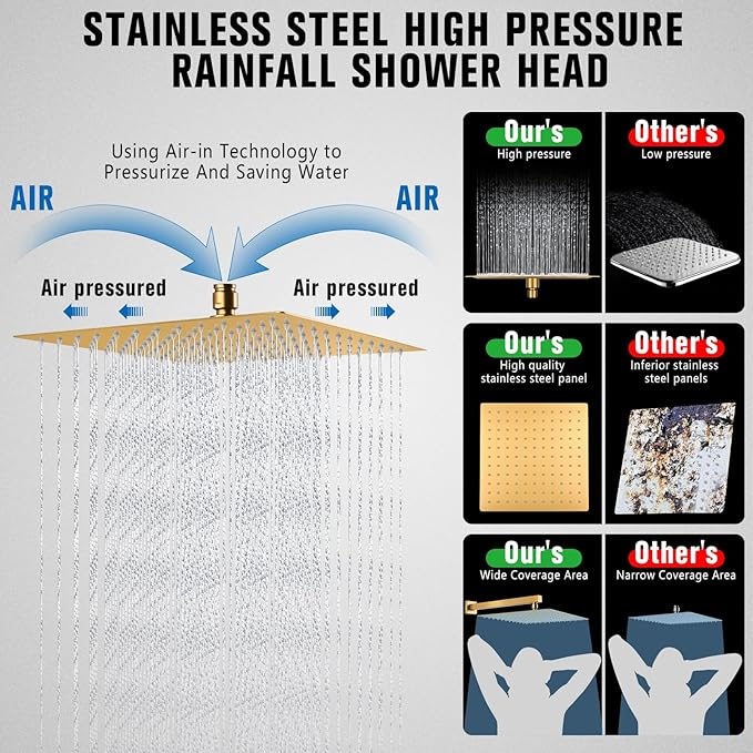- 【Rainfall Shower Experience】Features an ultra-slim rain showerhead with air-injection technology that mixes water and air to simulate natural rainfall, delivering powerful water pressure for a truly refreshing shower experience.