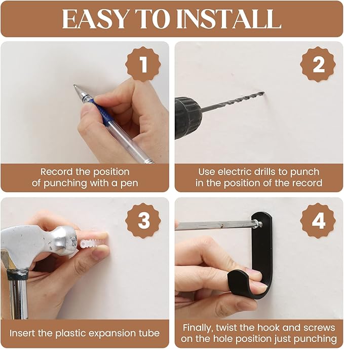 - 【Easy To Install】 - Equipped with 6 strong hooks, including 3 Pcs traceless transparent hooks(bear up to 22 LB), and 3 Pcs black space aluminum hooks, which are needed to drill holes for installation. But it is easy to assemble(The Steps show as the picture). Warm Tips: If you don't want to drill or your product weight is less than 22 LB, you can transparent hooks directly. Save your time!