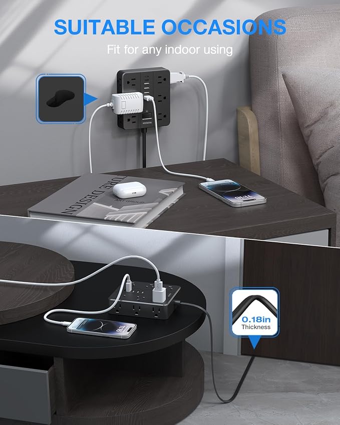 - 18 in 1 Power Strip with USB: This flat plug power strip could turn 1 socket into 12 AC outlets and 6 USB ports, 1.65 inchces widely spaced in between outlets, fit big adapters without blocking each other, keep your desktop organized; You can use it in any indoor place such as home, office and dorm room