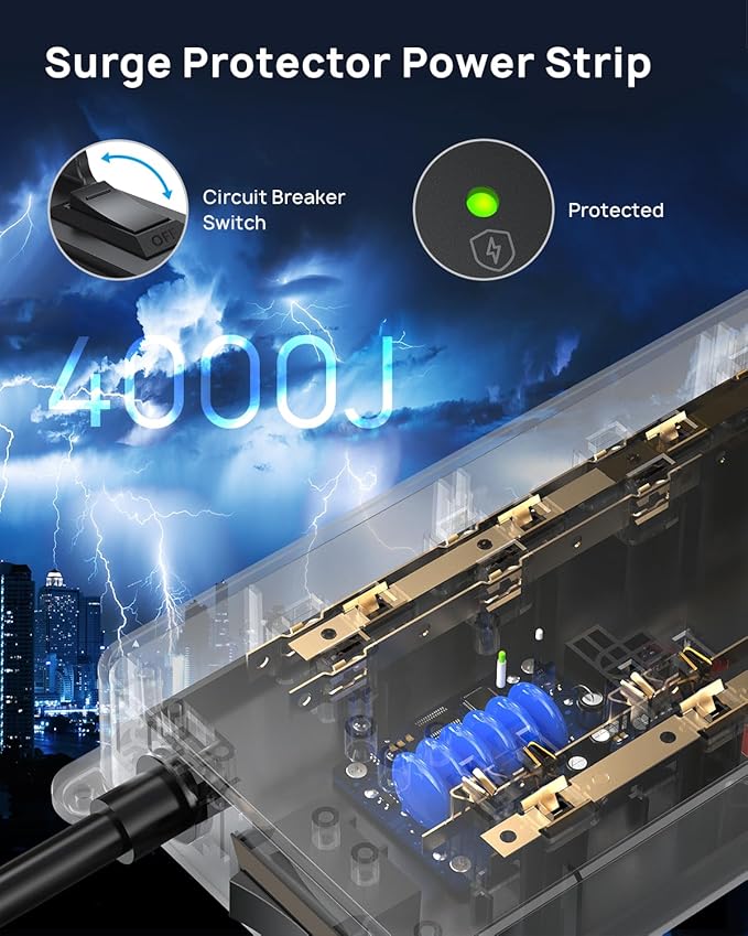 - 4000 Joules Surge Protection: This ETL-listed power strip is made from high-quality UL94 V-0 flame-retardant material. With a high surge protection rating, it helps safeguard your electronics from power spikes, surges, and lightning strikes