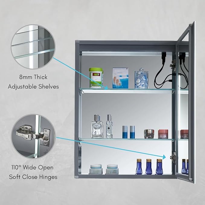 - Ideal for Steamy Bathrooms: Featuring a built-in anti-fog system, this lighted mirror medicine cabinet guarantees a clear reflection every time, even after the hottest showers; no need to wipe or wait, ensuring effortless grooming and making your morning routine faster and more efficient. Transform your bathroom space with a consistently fog-free experience that caters to your busy lifestyle, adding convenience and modern elegance in perfect harmony.